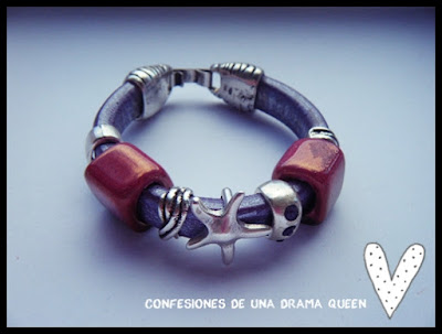 Se trata de una pulsera de la colección Deluxe, en cuero morado y piezas plateadas, otras de cerámica y algunas piedras moradas: